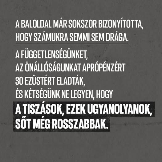 A baloldal már sokszor bizonyította, hogy számukra semmi sem drága. A függetlenségünket, az önállóságunkat aprópénzért 30 ezüstért eladták, és kétségünk ne legyen, hogy a tiszások, ezek ugyanolyanok,…