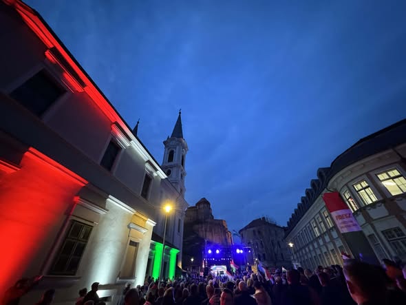 Tömegek várják Orbán Viktor beszédét az országjárás esztergomi állomásán.