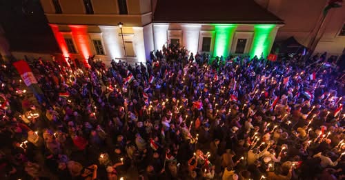 Óriási tömeg gyűlt össze Esztergomban, Orbán Viktor országjárásának újabb állomásán, a résztvevők fáklyákkal és zászlókkal töltötték meg a teret.