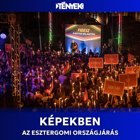 Óriási tömeg gyűlt össze Esztergomban, Orbán Viktor országjárásának újabb állomásán, a résztvevők fáklyákkal és zászlókkal töltötték meg a teret.